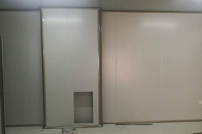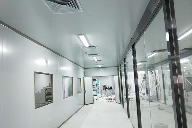 2) 間隔:用雙面彩鋼保溫板圍護及間隔,圍護面到天花頂;潔凈走廊及車間間隔處做通透鋁合金半玻璃窗,窗臺高900mm, 玻璃厚8mm, 高1200mm,玻璃窗高平門高度(2100mm);鋁合金窗料用特制凈化材料,45?度斜邊,與地面及天花交角做元弧及陰角接口,符合規范及衛生消毒要求。